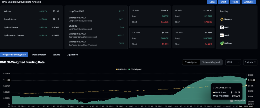 Theo dữ liệu từ CoinGlass, hợp đồng mở (Open Interest – OI) đối với BNB đã nhảy vọt 12% trong 24 giờ, đạt 2,11 tỷ USD. Đây là tín hiệu rõ ràng của tâm lý “risk-on” – nhà đầu tư sẵn sàng duy trì hoặc tăng vị thế mua, kỳ vọng giá sẽ còn tiếp tục tăng.