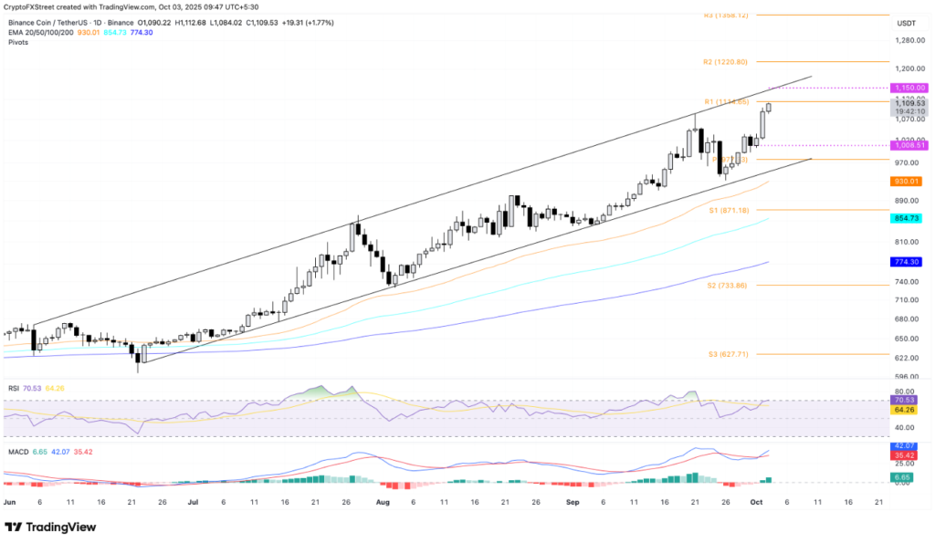 Tính đến chiều thứ Sáu, giá BNB đã duy trì trên mức 1.100 USD, bước vào giai đoạn “khám phá giá” đầy hứa hẹn. Đà tăng này không chỉ dựa trên yếu tố kỹ thuật mà còn phản ánh niềm tin của nhà đầu tư vào hệ sinh thái Binance ngày càng mở rộng và đa dạng.