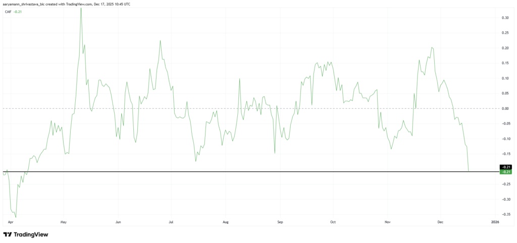Chỉ số on-chain cho thấy dòng tiền từ cộng đồng holder Pi Coin đang chảy ra mạnh mẽ, đặc biệt là qua chỉ số Chaikin Money Flow đã giảm xuống mức thấp nhất trong tám tháng. Sự rút vốn này phản ánh tâm lý thận trọng, thậm chí bi quan, của các nhà đầu tư khi giá liên tục lao dốc và các nỗ lực phục hồi trở nên vô vọng.
