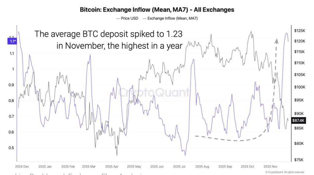 CryptoQuant nhận định, giá trị nạp trung bình của Bitcoin trong tháng 11 đã tăng vọt lên mức 1,23 BTC, mức cao nhất trong vòng một năm qua. So sánh với mức chỉ 0,6 BTC cách đây một tuần, sự tăng trưởng này phản ánh xu hướng các nhà đầu tư lớn đang tích cực nạp BTC khi thị trường điều chỉnh, có thể là để chuẩn bị bán ra hoặc giữ vị thế an toàn trong bối cảnh biến động giá.