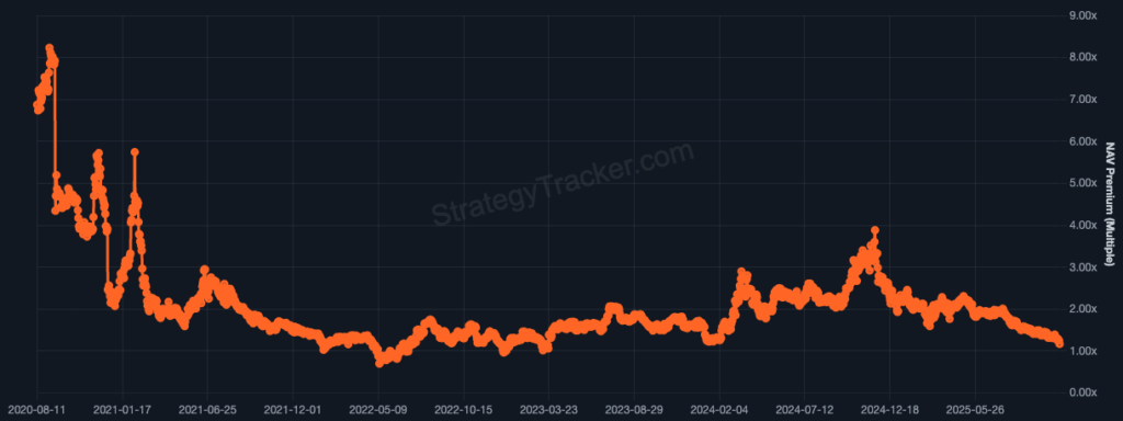 - Hệ số mNAV của Strategy, một chỉ số đo lường mối quan hệ giữa giá trị doanh nghiệp và lượng Bitcoin nắm giữ, đã giảm xuống còn khoảng 1,2 lần, thấp nhất kể từ tháng 3 năm 2023. Mức giảm này phản ánh sự giảm sút trong định giá của Strategy, khi giá Bitcoin giảm mạnh hơn so với giá trị tài sản ròng của công ty.