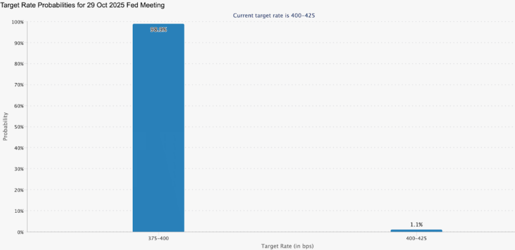 Theo dữ liệu từ công cụ FedWatch của CME Group, khả năng Cục Dự trữ Liên bang Mỹ (Fed) cắt giảm lãi suất 25 điểm cơ bản tại cuộc họp FOMC ngày 28-29/10 đã lên tới 99%. Dòng chảy thanh khoản mở rộng này dự kiến sẽ hỗ trợ đà tăng giá của Bitcoin, khi lãi suất thấp hơn giúp giảm chi phí vay vốn và thúc đẩy các hoạt động đầu tư, đặc biệt trong lĩnh vực tiền điện tử.