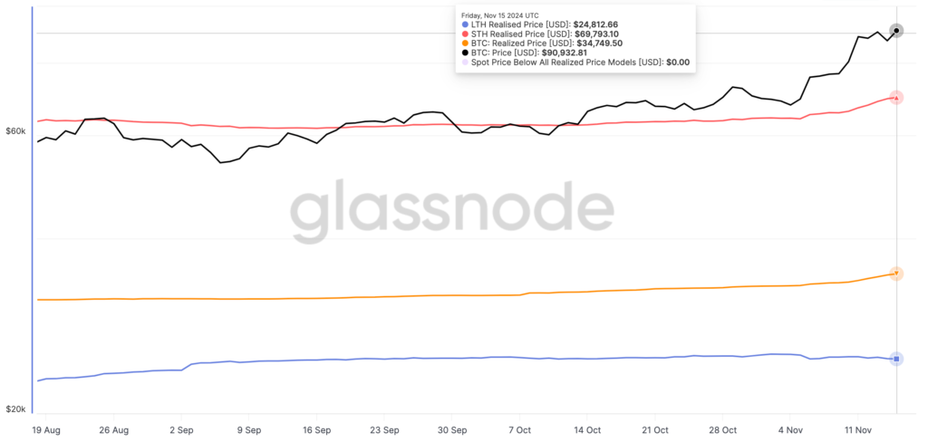 Một khía cạnh cần lưu ý khi xem xét triển vọng tăng trưởng của Bitcoin chính là giá thực hiện của những người nắm giữ ngắn hạn (STH) và dài hạn (LTH). Dữ liệu từ Glassnode cho thấy giá thực hiện của các nhà đầu tư STH hiện tại đang thấp hơn giá BTC, cho thấy rằng vẫn còn nhiều cơ hội cho giá Bitcoin tiếp tục tăng trưởng. Điều này phản ánh rằng có nhiều nhà đầu tư vẫn đang chuyển hướng sang tích lũy Bitcoin, chờ đợi một đợt tăng giá đáng kể trong tương lai.