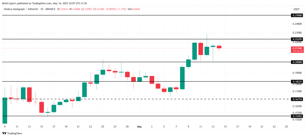 Dù triển vọng tăng trưởng là khả thi, nhưng cũng cần lưu ý rằng nếu HBAR không vượt qua được ngưỡng kháng cự 0.222 USD, nó có thể phải đối mặt với sự dao động trong khoảng giá. Nếu HBAR không giữ vững trên mức hỗ trợ 0.200 USD, thì tâm lý lạc quan có thể suy giảm. Điều này có khả năng đẩy HBAR xuống những mức giá thấp hơn, gần 0.182 USD.