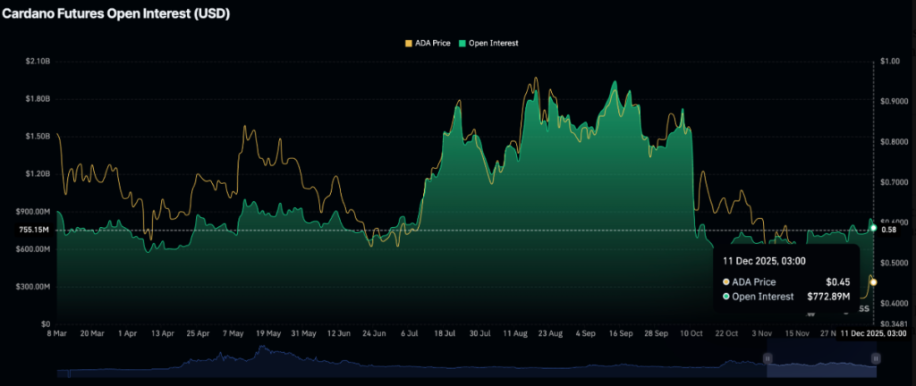 Trong bối cảnh đó, các nhà đầu tư nhỏ lẻ vẫn tỏ ra thận trọng hoặc rút lui khỏi các vị thế mua bán. Sự giảm sút trong nhu cầu mua vào của các nhà đầu tư nhỏ lẻ thể hiện rõ qua các số liệu về hợp đồng mở (Open Interest – OI). Cụ thể, OI của hợp đồng tương lai Cardano đã giảm từ mức đỉnh 1,95 tỷ USD xuống còn trung bình khoảng 773 triệu USD, phản ánh sự rút vốn và tâm lý thận trọng trên thị trường.