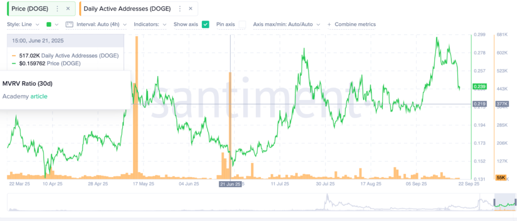 Cùng với áp lực bán ra, hoạt động trên mạng lưới của Dogecoin cũng đã cho thấy sự suy giảm. Số lượng ví hoạt động trung bình mỗi ngày đã giảm xuống chỉ còn quanh mức 55.000, một con số thấp hơn nhiều so với mức đỉnh 517.000 ví/ngày vào tháng 6. Sự gia tăng hoạt động mạng lưới vào tháng 6 trước đó đã dẫn đến đà tăng giá DOGE, đạt đến mức 0,2873 USD trong tháng 7.