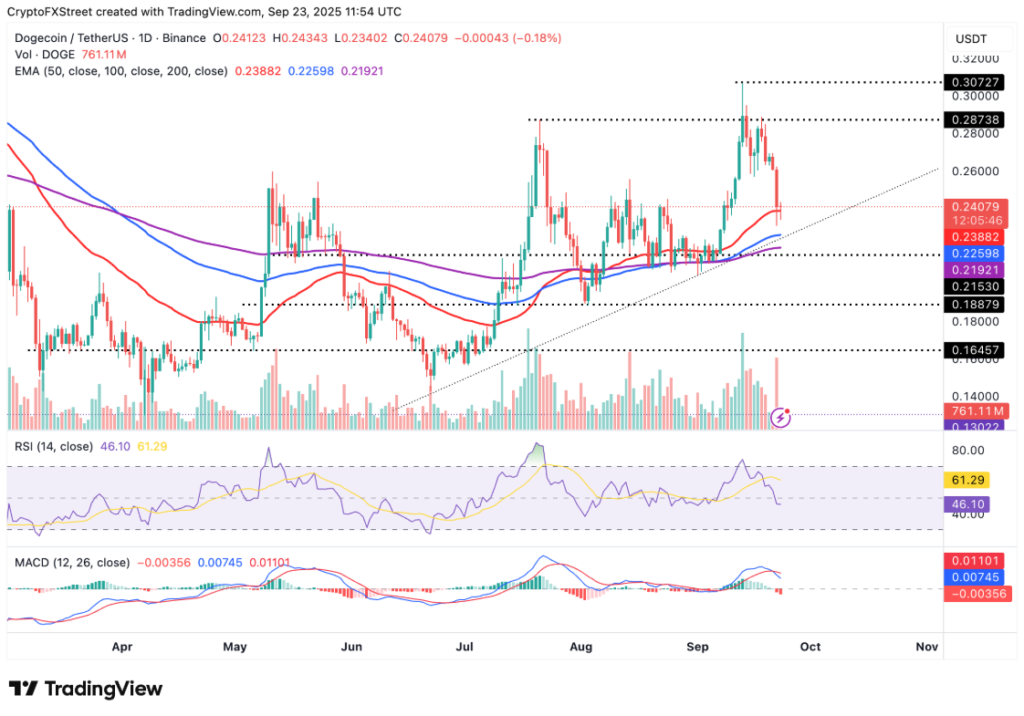 Từ góc độ phân tích kỹ thuật, DOGE hiện đang giao dịch gần đường trung bình động hàm mũ (EMA) 50 ngày, thiết lập hỗ trợ ngắn hạn tại mức 0,2387 USD. Các chỉ báo kỹ thuật cho thấy rằng xu hướng ngắn hạn của DOGE hiện tại vẫn nghiêng về phía giảm.