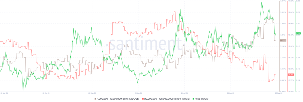 Theo dữ liệu từ Santiment, sự giảm giá của Dogecoin có liên quan đến hoạt động bán ra của các “cá voi” – những nhà đầu tư lớn nắm giữ lượng DOGE đáng kể. Tỷ lệ phần trăm nguồn cung từ nhóm ví nắm giữ từ 10 triệu đến 100 triệu DOGE đã giảm từ 16,85% hồi tháng 7 xuống còn 15,86%. Điều này cho thấy các cá voi đang có xu hướng cắt giảm vị thế để giảm rủi ro trong môi trường hiện tại.