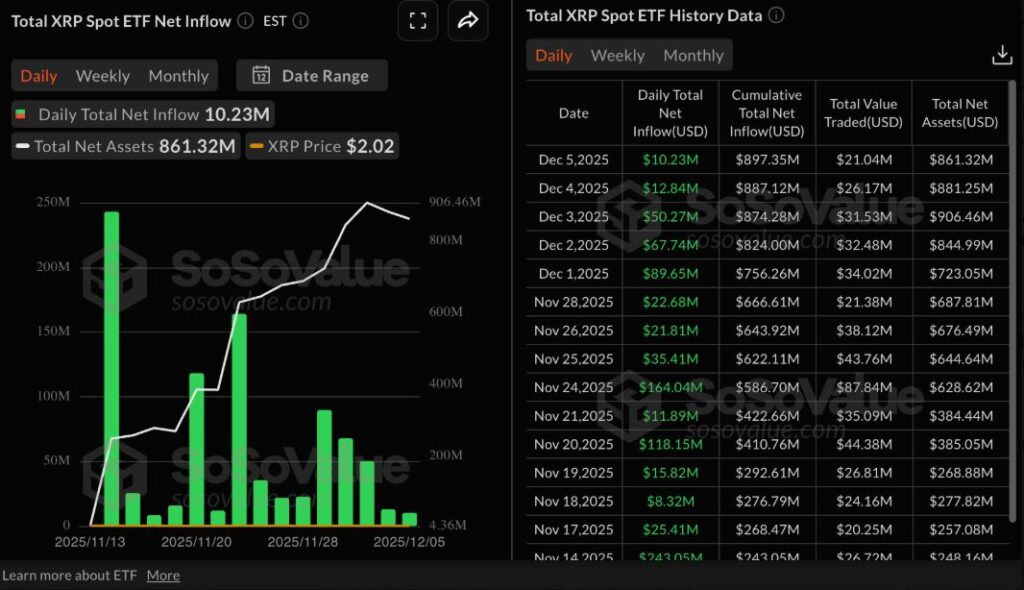 Kể từ ngày ra mắt vào ngày 13/11, các quỹ ETF XRP niêm yết tại Mỹ vẫn duy trì dòng tiền chảy vào liên tục, thể hiện sự tin tưởng của các nhà đầu tư tổ chức.