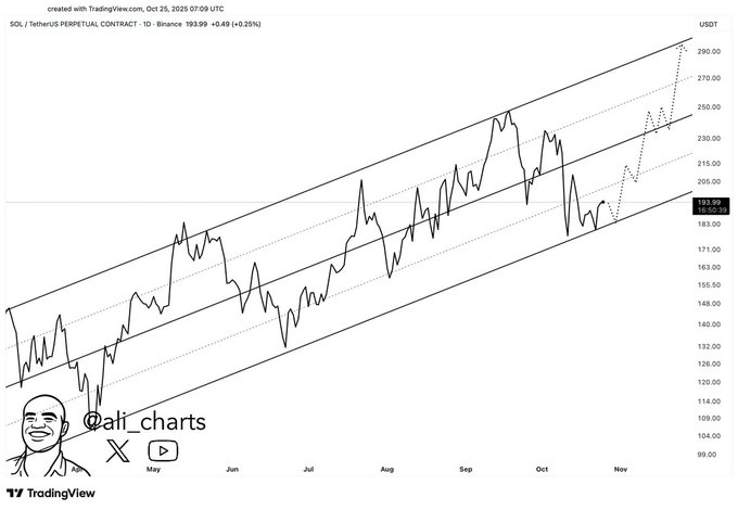 Solana đang trong một kênh giá tăng rõ ràng, từ tháng 5 đến nay. Các đợt giảm giá mạnh đều nhận được lực hỗ trợ tại biên dưới của kênh, giúp duy trì xu hướng tích lũy ổn định.