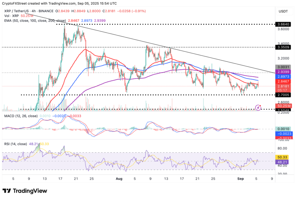 Trên khía cạnh kỹ thuật, XRP hiện đang thử thách mức hỗ trợ 2,80 USD, sau khi đánh mất một phần giá trị trong phiên giao dịch trước đó, phản ánh tâm lý ngần ngại của thị trường. Chỉ số sức mạnh tương đối (RSI) đang ở mức 46 và gần ngưỡng quá bán – một tín hiệu cho thấy động lực tăng đang suy yếu khi các lực lượng giảm giá có xu hướng chiếm ưu thế.