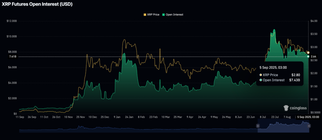Sự suy giảm nhu cầu từ nhà đầu tư bán lẻ đối với XRP đang trở thành một vấn đề đáng báo động. Theo số liệu thị trường, hợp đồng mở (Open Interest – OI) trên các sàn giao dịch phái sinh đã giảm xuống còn 7,4 tỷ USD, sau khi đạt đỉnh 10,94 tỷ USD vào ngày 22/7. Đây là một chỉ báo cho thấy niềm tin vào khả năng phục hồi ngắn hạn của XRP đang dần mai một.