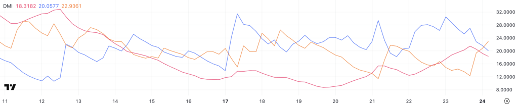 Biểu đồ DMI (Directional Movement Index) của Ethereum đang cho thấy một số tín hiệu quan trọng về xu hướng giá. Hiện tại, chỉ số ADX (Average Directional Index) có giá trị 18.3, giảm so với mức 21.4 trước đó. Điều này cho thấy sức mạnh của xu hướng hiện tại đang giảm sút. Thông thường, khi ADX nằm dưới ngưỡng 20, điều này báo hiệu rằng thị trường không có động lực mạnh mẽ, điều này càng củng cố cho quan điểm rằng Ethereum đang trải qua một giai đoạn điều chỉnh suy yếu.