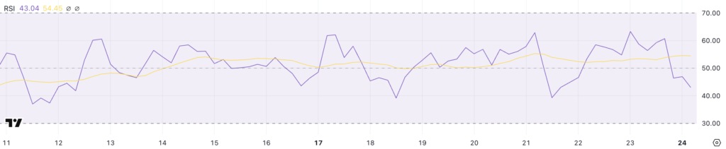Theo chỉ số Sức mạnh Tương đối (RSI), một công cụ tiêu chuẩn để đo lường động lượng thị trường, Ethereum đã trải qua một biến động đáng kể. RSI đã tăng lên 63.2 sau sự kiện hack nhưng sau đó giảm mạnh xuống còn 43 vào thời điểm hiện tại. Sự sụt giảm này có thể được hiểu là dấu hiệu rõ ràng về sự thay đổi trong tâm lý thị trường từ tích cực sang tiêu cực, vốn phản ánh sự bất ổn không chỉ của ETH mà của toàn bộ thị trường.