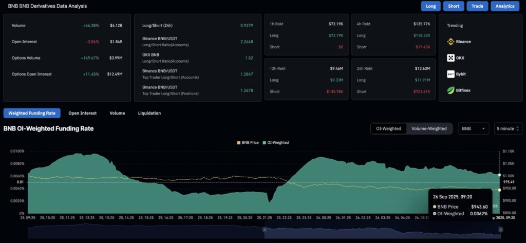 Theo số liệu từ CoinGlass, hợp đồng mở (Open Interest – OI) của BNB đã ghi nhận sự sụt giảm 3,56% trong 24 giờ qua, giảm xuống còn 1,84 tỷ USD. Sự rút vốn mạnh mẽ khỏi thị trường phái sinh cho thấy tâm lý thận trọng của nhà đầu tư, họ đang tránh xa những rủi ro.