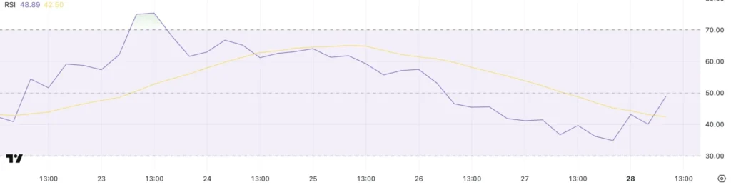 Hiện tại, với RSI ở mức 48.89, có khả năng cho phép XCN tiếp tục phục hồi nếu động lực tích cực được duy trì. Nếu lực cầu tăng lên, XCN có thể quay trở lại vùng giá cao hơn mà không gặp rào cản từ trạng thái quá mua trong quá khứ.