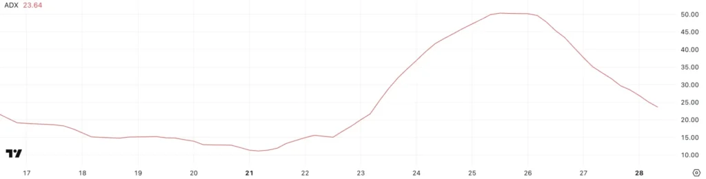 Chỉ số ADX hiện đang ở mức 23.64, một dấu hiệu cho thấy sức mạnh của xu hướng hiện tại đã giảm sút so với mức 50 mà nó đạt được cách đây hai ngày. Điều này báo hiệu có thể sự giảm động lực xảy ra sau một đợt tăng trưởng mạnh đầu tuần. Mặc dù XCN vẫn trong xu hướng tăng, nhưng sức mạnh xu hướng đã suy yếu, điều này cần được coi là một yếu tố cần lưu ý cho các nhà đầu tư.