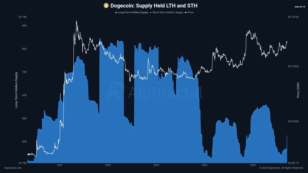 Theo Alphractal, khi các nhà đầu tư ngắn hạn (STHs) bắt đầu tích lũy một loại tài sản, thường dẫn đến những kỳ vọng tăng giá mạnh mẽ. Các nhà đầu tư này đang thể hiện sự tin tưởng vào DOGE, hy vọng rằng giá của nó sẽ phục hồi sau giai đoạn suy giảm này.
