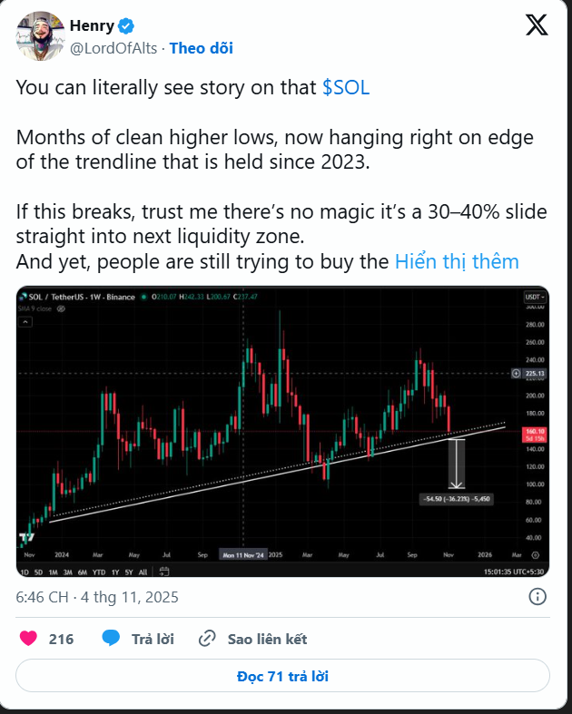 - Nguy cơ giảm 30%-40%: Nếu SOL mất đường xu hướng chính, giá có thể lao dốc về vùng 100 USD, thậm chí thấp hơn.