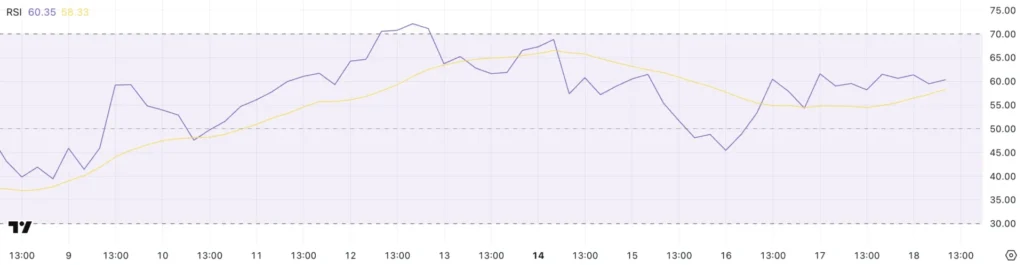 Hiện tại, RSI của Solana đang ở mức 60.35, cho thấy sự tăng trưởng đáng kể từ mức 45 chỉ hai ngày trước. Mặc dù có sự gia tăng này, nhưng RSI đã bắt đầu ổn định, chỉ ra rằng áp lực tăng có thể đang giảm dần. Mức RSI 60.35 cho thấy SOL đang ở gần vùng quá mua nhưng vẫn chưa đạt đến mức có thể cần điều chỉnh. Điều này ngụ ý rằng mặc dù có động lực tích cực từ thị trường, SOL có thể đối mặt với một số thử thách trong việc đạt được mức tăng trưởng mạnh mẽ hơn trong thời gian tới.