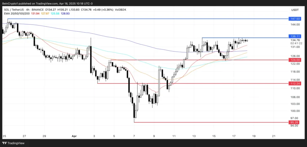Trong bảy ngày qua, Solana (SOL) đã chứng kiến mức tăng trưởng ấn tượng 13%, thể hiện sức mạnh đáng kể trong ngắn hạn. Tuy nhiên, tại mức giá khoảng 136 USD, SOL đã bắt đầu gặp kháng cự quan trọng, có thể ảnh hưởng đến xu hướng phát triển tiếp theo của đồng tiền này. Các chỉ báo động lượng như Chỉ Số Sức Mạnh Tương Đối (RSI) và Đường Trung Bình Động Exponential (EMA) hiện vẫn hỗ trợ cho đà tăng, nhưng dấu hiệu gần đây cho thấy có thể có sự chững lại.