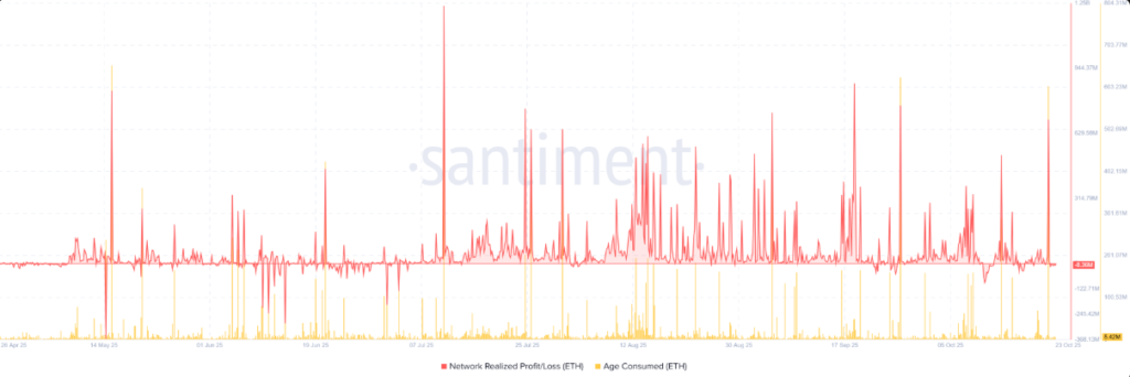 Dữ liệu từ Santiment cho thấy, các hoạt động di chuyển token lâu ngày (Age Consumed tăng vọt) là dấu hiệu cho thấy lượng lớn ETH “ngủ yên” đã bất ngờ thay đổi địa chỉ ví, làm gia tăng lo ngại về khả năng phân phối nguồn cung và gây áp lực giảm giá.