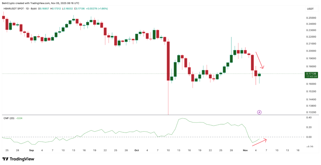 Dữ liệu on-chain cho thấy, dù giá HBAR vẫn còn trong giai đoạn điều chỉnh, dòng tiền vào thị trường đang có xu hướng tăng trở lại từ ngày 3/11. Chỉ báo CMF đã ghi nhận mức tăng, phản ánh dòng tiền của các nhà đầu tư lớn (cá voi, nhà đầu tư dài hạn) đang chảy vào thị trường một cách âm thầm nhưng mạnh mẽ.