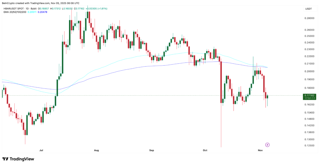Sự đối lập giữa các tín hiệu này phản ánh giai đoạn giằng co quyết liệt của thị trường. Trong khi các chỉ số dài hạn cho thấy áp lực giảm vẫn còn, các tín hiệu phân kỳ cho thấy lực mua bắt đầu quay trở lại, tạo ra một trạng thái cân bằng tạm thời. Điều này khiến giá HBAR duy trì trong biên độ ổn định kể từ ngày 11/10, thể hiện sự đấu tranh giữa lực mua ngắn hạn và lực bán dài hạn.