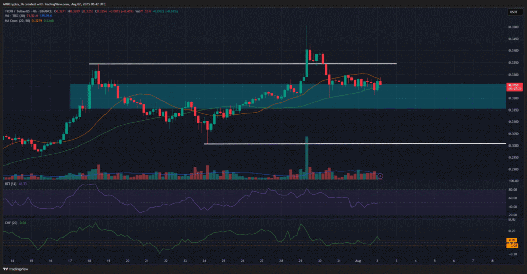 Khối lượng giao dịch trong tháng 7 duy trì ở mức khá tích cực, vượt qua mức trung bình 20 ngày. Đồng thời, chỉ báo CMF (Chaikin Money Flow) luôn giữ trên mức +0,05, cho thấy rằng dòng tiền đang nghiêng về bên mua. Ngược lại, chỉ báo MFI (Money Flow Index) đã giảm xuống dưới ngưỡng 50 nhưng chưa phát ra tín hiệu bán mạnh, củng cố khả năng TRX sẽ tiếp tục tăng giá trong tương lai gần.
