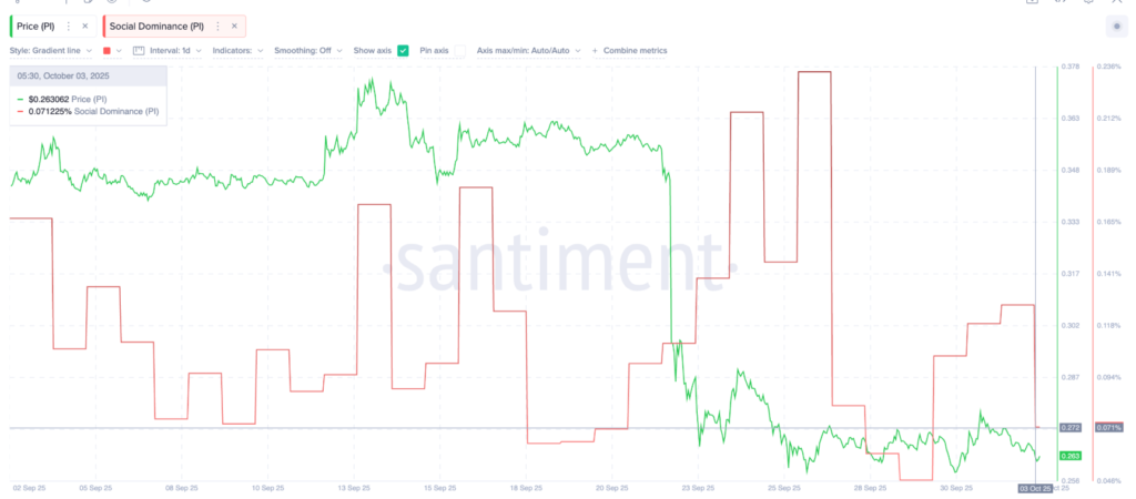 Lịch sử cho thấy, khi social dominance chạm đáy cục bộ, giá Pi Coin thường có xu hướng giảm mạnh. Cụ thể, ngày 19/9, social dominance giảm đến mức thấp nhất, sau đó giá đồng coin này rơi từ 0,36 USD xuống còn 0,26 USD trong vòng vài ngày. Các đợt giảm giá này cũng diễn ra sau những đợt cạn kiệt trong thảo luận cộng đồng, cho thấy tâm lý nhà đầu tư đang trở nên bi quan hơn bao giờ hết.