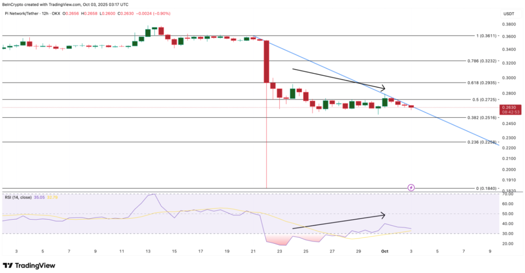 Biểu đồ khung 12 giờ của Pi Coin đang hình thành mô hình tam giác giảm – một mô hình kỹ thuật mang xu hướng giảm giá rõ rệt. Trong mô hình này, giá liên tục tạo các đỉnh thấp dần nhưng vẫn duy trì trong vùng hỗ trợ chính.