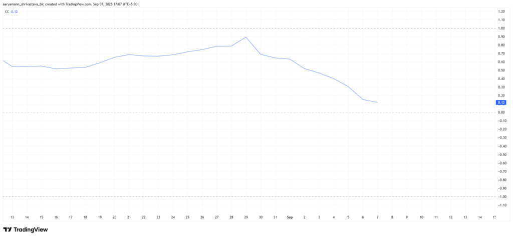 Hiện nay, tương quan giữa Pi Coin và Bitcoin chỉ còn ở mức 0,12, một con số không khả quan cho thấy Pi Coin đang hoạt động gần như độc lập với sự biến động của Bitcoin – đồng tiền điện tử lớn nhất thế giới. Điều này tạo ra một sự phân kỳ rõ rệt giữa Pi Coin và Bitcoin, khiến cho đồng tiền này không thể tận dụng sức mạnh từ xu hướng chung của thị trường. Ngược lại, Pi Coin đang phải đối mặt với áp lực bán gia tăng và sự giảm sút niềm tin từ nhà đầu tư, dẫn đến tình hình giá ngày càng yếu đi.