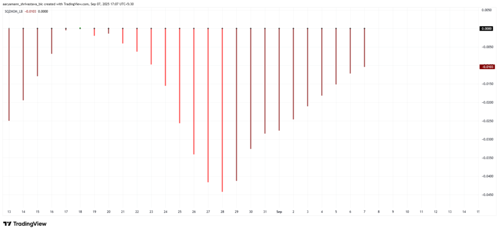 Từ khía cạnh kỹ thuật, các chỉ báo hiện tại không mấy hứa hẹn. Chẳng hạn, chỉ báo Squeeze Momentum Indicator đang bật tín hiệu cảnh báo với những điểm màu đen, thường cho thấy một giai đoạn biến động lớn sắp diễn ra. Lịch sử đã chỉ ra rằng những tín hiệu này thường xuất hiện khi giai đoạn “squeeze” chuẩn bị kết thúc. Tuy nhiên, với tâm lý thị trường hiện tại, nghiêng về xu hướng giảm, nhiều khả năng một đợt biến động sắp tới sẽ làm Pi Coin giảm sâu hơn mà không thể hồi phục.
