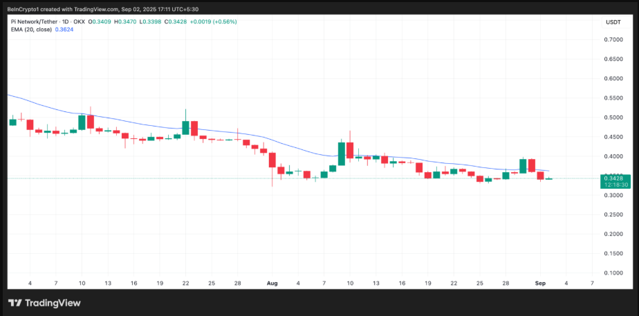 Mặc dù có những phát triển tích cực này, hiệu suất giao dịch của PI vẫn chưa đạt được mức kỳ vọng. Hiện tại, giá của altcoin này dao động quanh mức 0,34 USD, dưới mức đường trung bình động hàm mũ (EMA) 20 ngày, đang đóng vai trò là ngưỡng kháng cự động tại mức 0,36 USD.