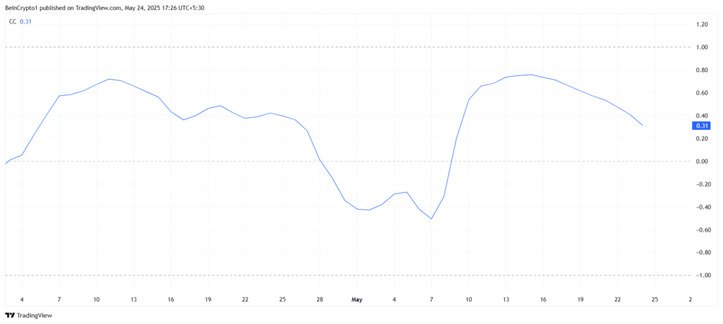 Gần đây, giá của Pi Network đã thể hiện sự suy yếu rõ rệt trong mối tương quan với Bitcoin, chỉ số hiện đang được đo ở mức 0.25 và có dấu hiệu tiếp tục giảm. Sự giảm sút này cho thấy rằng Pi Network dường như đang tách biệt hơn bao giờ hết khỏi những diễn biến của Bitcoin, một trong những đồng tiền điện tử lớn nhất và có ảnh hưởng nhất trên thị trường.