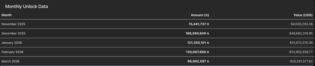 Vào tháng 12, sẽ có khoảng 186 triệu token PI được mở khóa, chiếm đến 43% tổng nguồn cung hiện có trên các sàn giao dịch. Thông thường, các đợt mở khóa lớn như vậy sẽ tạo áp lực bán mạnh mẽ, nhất là trong bối cảnh tâm lý thị trường còn chưa ổn định.