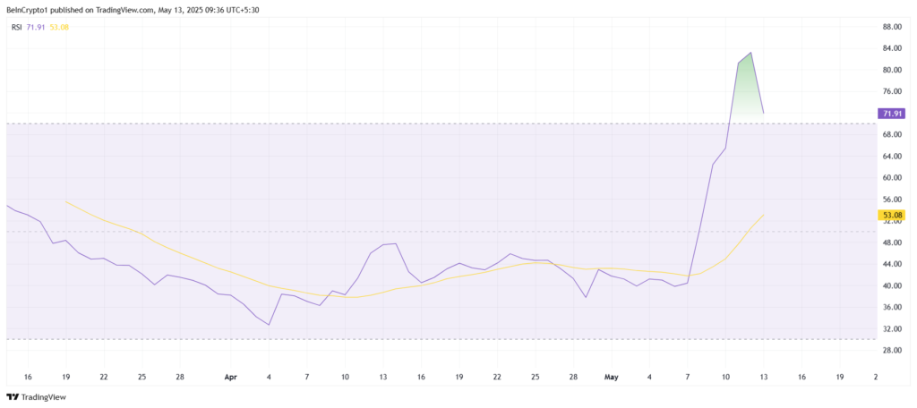 Một trong những chỉ báo đáng chú ý hiện nay là Chỉ số Sức mạnh Tương đối (RSI), đã vượt ngưỡng 70.0, chỉ ra rằng Pi Network đang bước vào vùng quá mua. Mặc dù điều này có thể báo hiệu một khả năng đảo chiều, nhưng thực tế cho thấy, không ít tài sản tiền điện tử đã duy trì được động lực tăng kể cả khi ở vùng quá mua trong một khoảng thời gian dài.
