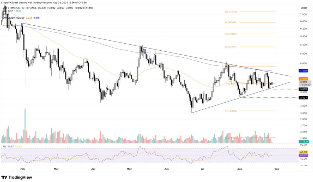 Trên biểu đồ khung ngày, Polkadot (DOT) đang tiến triển tích cực trong mô hình tam giác đối xứng, hiện đang thử thách đường trung bình động hàm mũ (EMA) 50 ngày tại mức 3,928 USD. Nếu DOT có thể vượt qua ngưỡng này, tiền điện tử đa chuỗi có khả năng tiếp tục hướng đến đường EMA 200 ngày tại mức 4,318 USD, nơi cũng gần với đường kháng cự của mô hình.