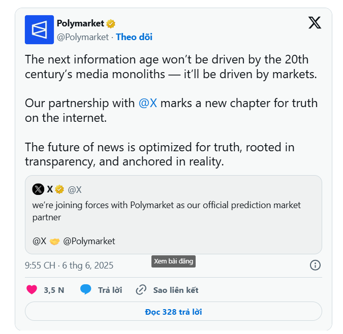 Polymarket từ trước đến nay đã được biết đến như một thị trường dự đoán độc đáo, nơi người dùng có thể đặt cược vào các sự kiện và kết quả trong nhiều lĩnh vực khác nhau, từ chính trị đến thể thao. Với việc hợp tác cùng nền tảng X, Polymarket đang hướng tới việc trở thành “đối tác thị trường dự đoán chính thức” của mạng xã hội này. Điều này không chỉ mở rộng khả năng tiếp cận của Polymarket mà còn mang lại nhiều lợi ích cho người dùng trên nền tảng X.