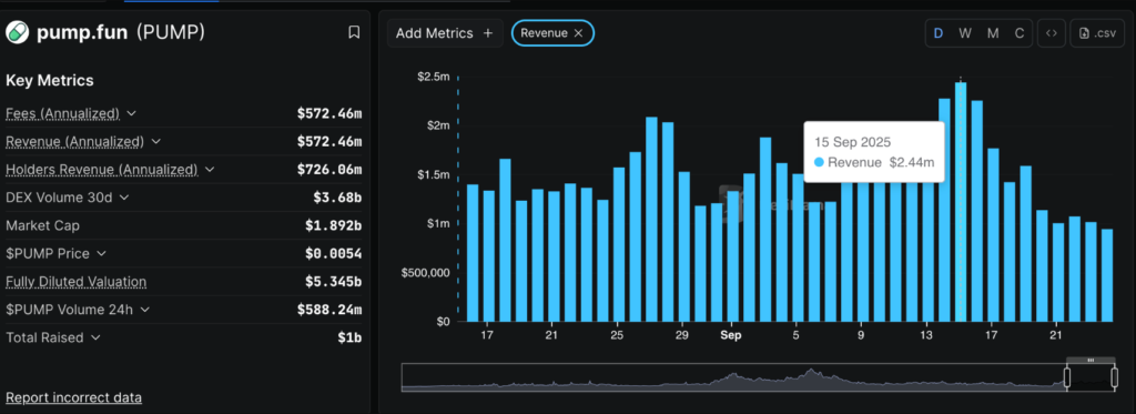 Theo số liệu từ DefiLlama, doanh thu của Pump.fun đã đạt đến 2,44 triệu USD vào ngày 15/9, ngay sau khi PUMP ghi nhận mức đỉnh lịch sử. Tuy nhiên, sau đợt tăng trưởng ngắn hạn đó, doanh thu đã giảm xuống còn khoảng 945.000 USD vào cuối tuần này. Sự điều chỉnh này phản ánh một bức tranh tồi tệ trong bối cảnh sự suy giảm chung của thị trường tiền điện tử, liên quan đến tâm lý thận trọng giữa bất ổn kinh tế tại Mỹ.