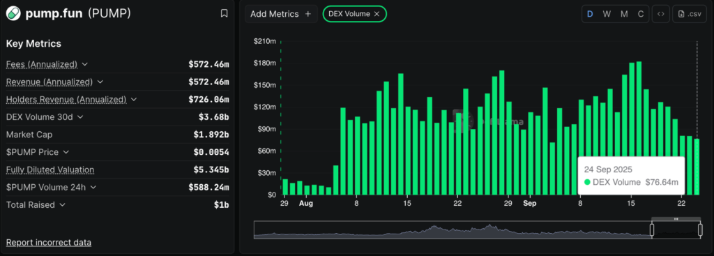 Xu hướng giảm này cũng rất rõ ràng qua khối lượng giao dịch trên các sàn phi tập trung (DEX). Sau khi đạt đỉnh 182 triệu USD vào ngày 16/9, con số này đã tụt xuống còn khoảng 77 triệu USD, cho thấy hoạt động giao dịch trên bệ phóng meme coin đang có dấu hiệu nguội lạnh. Nếu tình trạng này tiếp diễn, triển vọng phục hồi giá PUMP có thể sẽ đối mặt với nhiều thách thức, đồng thời cũng sẽ gây ảnh hưởng đến khả năng thu hút vốn mới từ các nhà đầu tư.