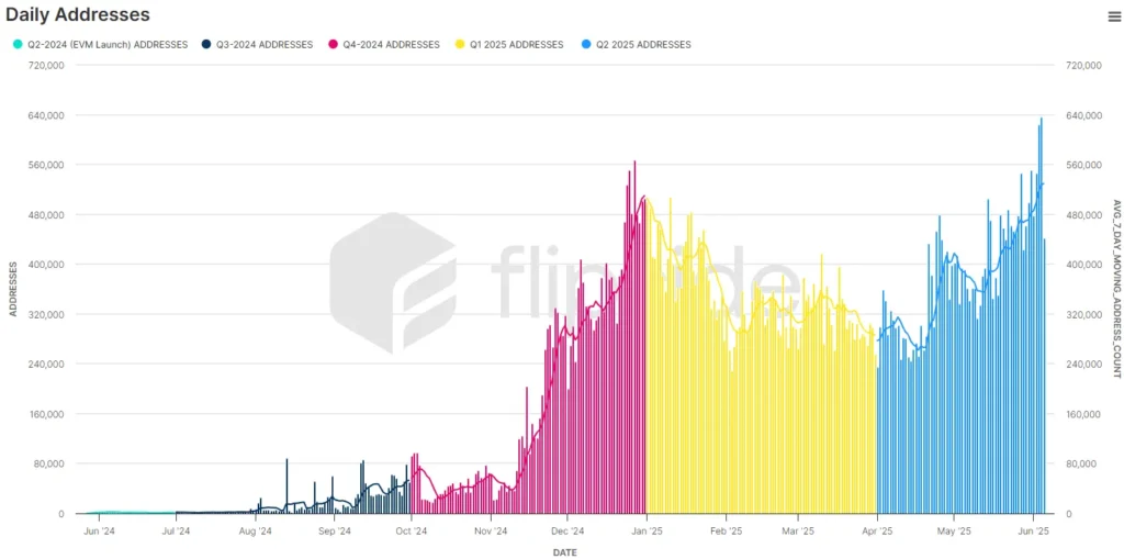 Theo dữ liệu từ Flipside, từ đầu năm 2025, Sei Network đã thu hút thêm 17 triệu địa chỉ mới, đưa tổng số địa chỉ hoạt động lên tới 26.8 triệu. Quý 2 năm 2025 đánh dấu một giai đoạn phát triển bứt phá cho Sei, với hơn 330,000 địa chỉ mới được ghi nhận mỗi ngày.