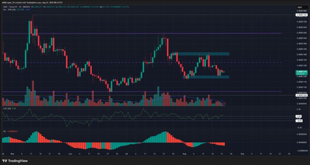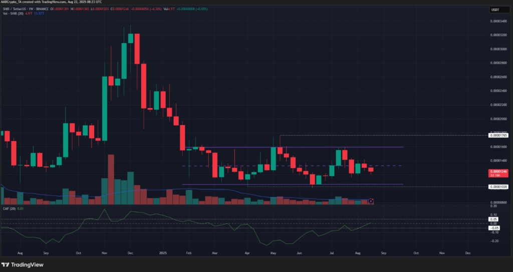 Trên khung tuần, các mốc dao động quan trọng cho SHIB hiện tại nằm tại 0,00001765 USD và 0,00001028 USD. Chỉ báo Chaikin Money Flow (CMF) đang có xu hướng tăng nhẹ, mặc dù vẫn chưa vượt ngưỡng +0,05, điều này cho thấy một số lượng mua nhất định đã xuất hiện nhưng chưa đủ mạnh để dẫn dắt thị trường đi lên.