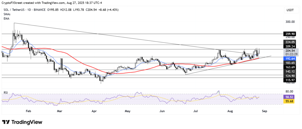Đặc biệt, SOL đã bứt phá khỏi mô hình tam giác cân, với đường trung bình động đơn giản 50 ngày (SMA) hoạt động như một hỗ trợ quan trọng quanh khu vực 180 USD. Chỉ số RSI hiện duy trì trên mức trung lập, cho thấy xu hướng tích cực từ ba tuần qua, mặc dù diễn biến thị trường cho thấy mức độ biến động vẫn cao.