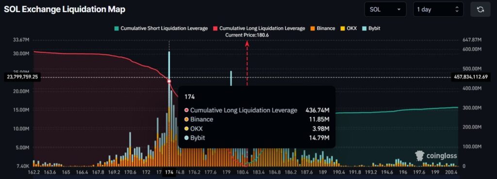 Bên cạnh đó, các chỉ số thanh lý cho thấy một mức hỗ trợ vững chắc tại $174 và vùng kháng cự quan trọng ở mức $184. Trong khi số lệnh long đạt $436,74 triệu, lệnh short chỉ ở mức $23,79 triệu, cho thấy rõ ràng sự thống trị mạnh mẽ của phe bò, đồng thời làm nổi bật ngưỡng $184 như một điểm quyết định trong xu hướng giá tới.