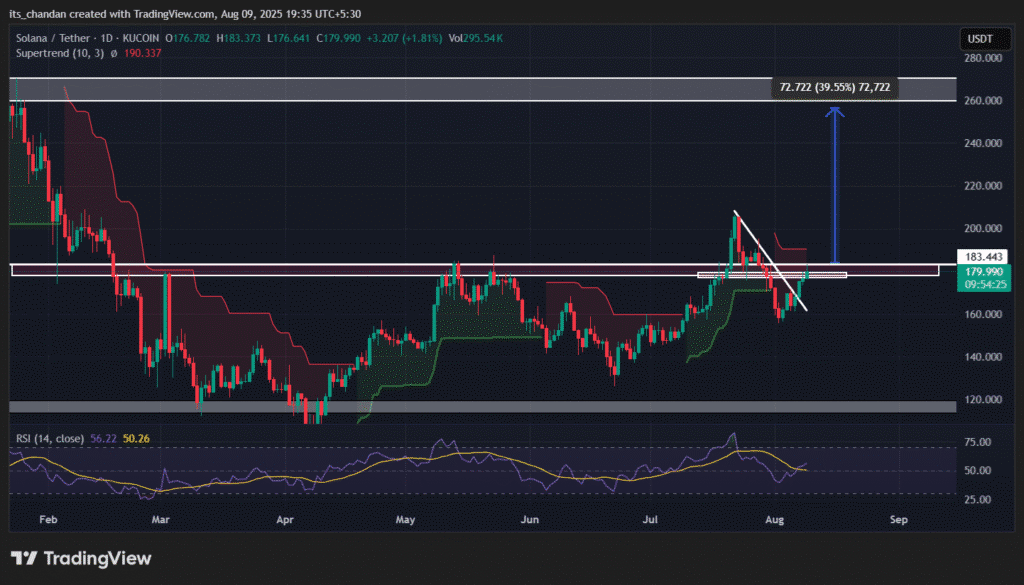 Tính đến ngày 9 tháng 8, giá SOL dao động quanh mức $181, sau khi ghi nhận mức tăng 3,05% trong 24 giờ qua, đánh dấu ba ngày liên tiếp của xu hướng đi lên. Thế nhưng, khi giá tiến gần đến ngưỡng kháng cự quan trọng, sự quan tâm từ các nhà đầu tư có dấu hiệu suy giảm. Theo báo cáo từ Tạp Chí Bitcoin, khối lượng giao dịch trong 24 giờ của SOL đã giảm 10% so với ngày trước đó, cho thấy một tâm lý thận trọng từ phía các trader.