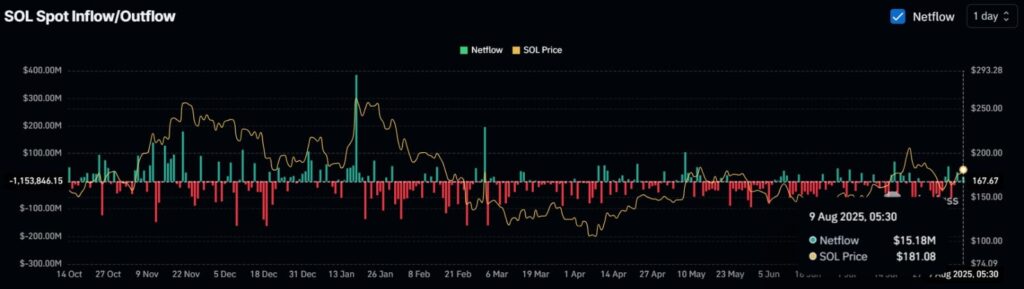 Dữ liệu từ CoinGlass cho thấy dòng tiền vào sàn giao dịch đạt khoảng $15,18 triệu vào ngày 9 tháng 8. Những dòng tiền như vậy trong các giai đoạn tăng giá thường chỉ ra rằng nhà đầu tư đang chuẩn bị để bán ra khi giá đạt mức cao nhất. Điều này đặt ra một câu hỏi quan trọng về khả năng duy trì đà tăng của Solana.