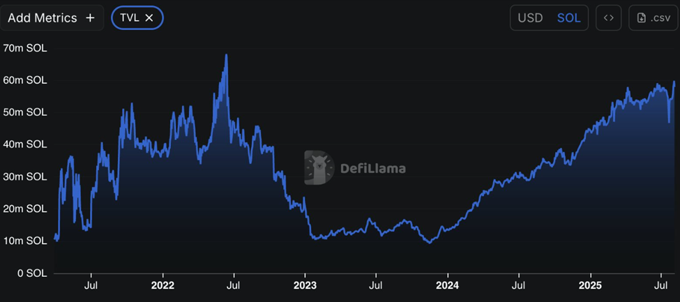 Ngoài ra, thông tin từ DeFiLlama cho thấy Tổng giá trị bị khóa (TVL) của Solana, tính bằng token SOL gốc, đang ở mức cao nhất trong hơn ba năm qua. Điều này cho thấy rằng người dùng và các giao thức DeFi dường như đang có xu hướng giữ lại tài sản trong dài hạn.