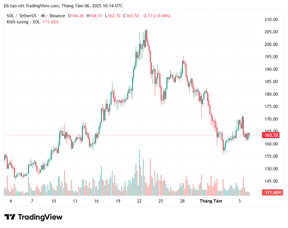 Tính đến thời điểm hiện tại, giá SOL đang giao dịch quanh mức 163,5 USD, giảm hơn 3% trong 24 giờ qua. Sự biến động này theo dõi những gì đang diễn ra trong thị trường tiền điện tử toàn cầu và cho thấy Solana vẫn cần thời gian và nỗ lực để khẳng định vị thế của mình trong lòng cộng đồng đầu tư.