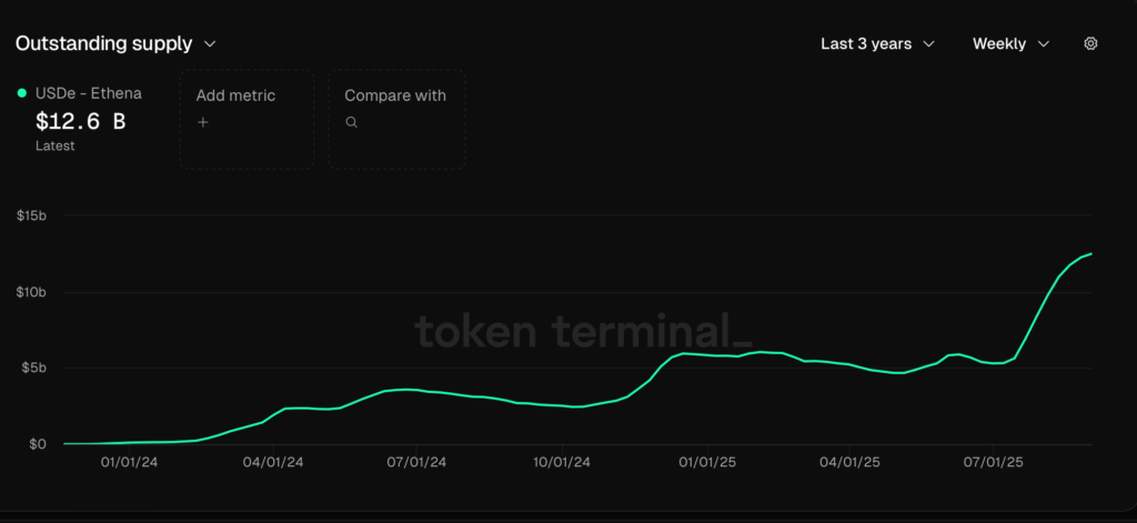 Theo báo cáo tháng 9 từ Binance Research, USDe đã trở thành stablecoin tăng trưởng nhanh nhất trong lịch sử, với nguồn cung vượt mốc 10 tỷ USD chỉ trong chưa đầy 10 tháng. Hiện tại, nguồn cung USDe đã đạt 12,6 tỷ USD, vượt qua cả Tether (USDT) với 88 tháng để đạt tới mức này và Circle (USDC) với 38 tháng.